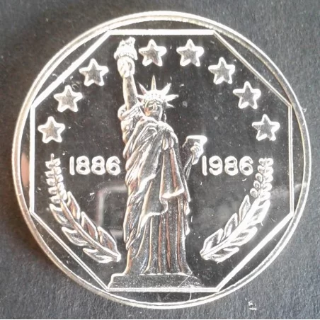 Obverse: The obverse features a depiction of the Statue of Liberty with her outstretched torch. Eight stars decorate the edge along the top half of the round while laurel leaves flank either side of the statue on the bottom half. The dates 1886 and 1986 are inscribed on either side representing the centennial year of the Statue of Liberty.